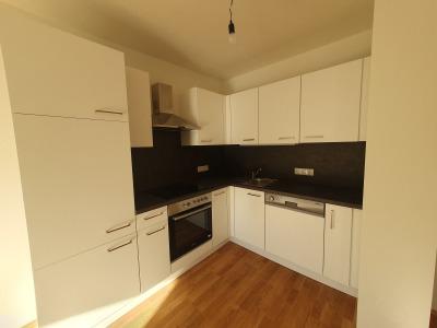 Die moderne Einbauküche komplettiert das Bild und ist mit Ceranfeld, Backofen, Dunstabzugshaube, Geschirrspüler und einem Kühlschrank inklusive Gefrierfach ausgestattet.