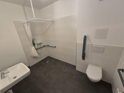 Das Badezimmer ist mit einer praktischen Duschwanne und WC ausgestattet, während ein Abstellraum zusätzlichen Stauraum für Ihre persönlichen Gegenstände bietet.